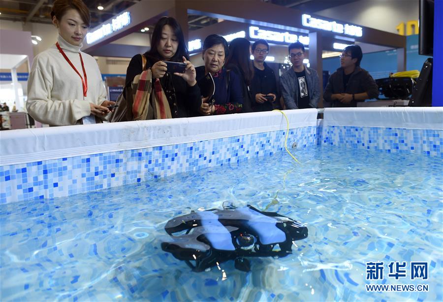 11月10日,人們?cè)谡箷?huì)現(xiàn)場觀看展出的一款小型水下機(jī)器人。 新華社記者韓傳號(hào)攝