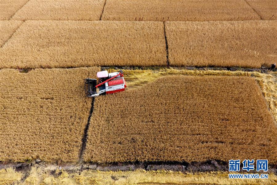 在太原市晉源區(qū)赤橋村,收割機(jī)在稻田里作業(yè)(10月17日無人機(jī)拍攝)。近日,山西省太原市晉源區(qū)2000多畝水稻迎來收割季。 金秋時節(jié),農(nóng)民們忙著收獲成熟的農(nóng)作物,喜迎豐收。 新華社記者 詹彥 攝