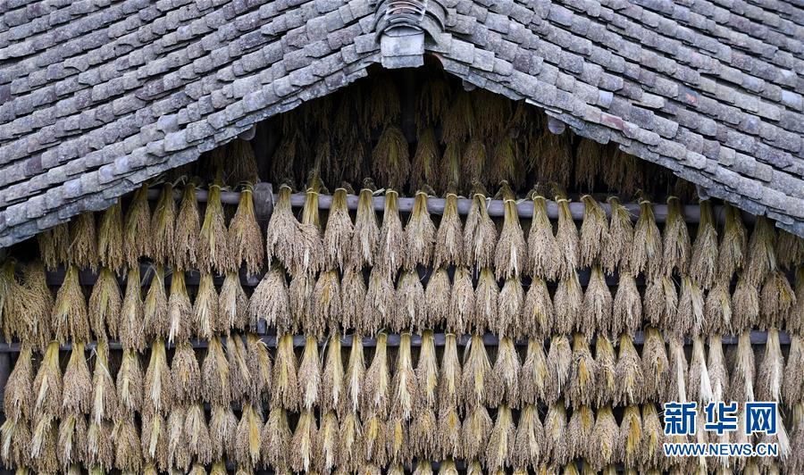 這是貴州省黔東南苗族侗族自治州從江縣高增鄉(xiāng)占里村一處屋檐下晾曬的稻谷(10月17日攝)。 金秋時節(jié),農(nóng)民們忙著收獲成熟的農(nóng)作物,喜迎豐收。 新華社記者陳曄華攝