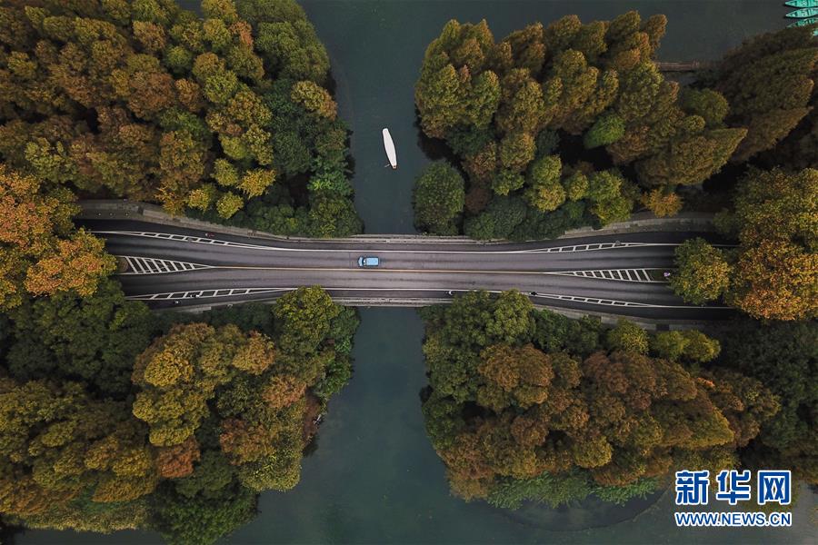 11月13日無人機拍攝的杭州西湖一景。 時值初冬,杭州市西湖景區(qū)層林盡染,色彩斑斕,別有一番韻味。