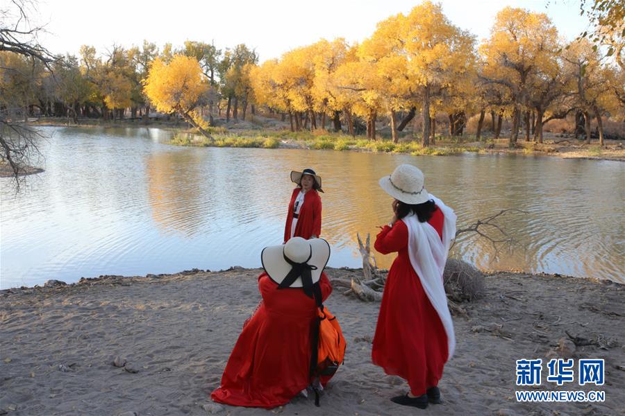 10月10日,在內(nèi)蒙古自治區(qū)額濟納旗,游客在胡楊林前留影。 金秋時節(jié),內(nèi)蒙古自治區(qū)額濟納旗胡楊林如同披上金裝,成為大漠中的一抹亮色,吸引眾多中外游客前來觀賞游玩。 新華社記者安希雅攝