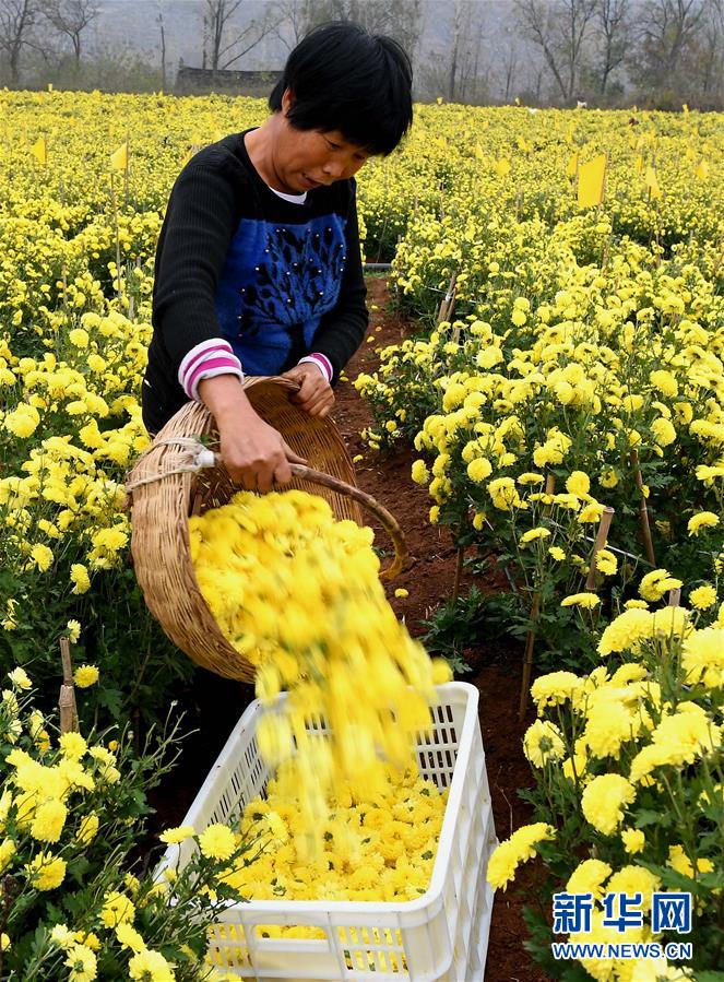11月14日,在河南省內(nèi)鄉(xiāng)縣乍曲鎮(zhèn)水溝村千畝酈邑貢菊基地,農(nóng)戶將采摘的菊花裝筐。 近年來,河南省內(nèi)鄉(xiāng)縣依托資源優(yōu)勢,把發(fā)展特色農(nóng)業(yè)作為精準(zhǔn)扶貧的重要舉措,采取“公司+合作社+農(nóng)戶”的方式,招引農(nóng)業(yè)龍頭企業(yè)發(fā)展菊花種植產(chǎn)業(yè),把菊花加工成茶飲、藥材等高附加值產(chǎn)品,累計(jì)帶動(dòng)150余戶貧困戶就業(yè)增收。 新華社記者 李安 攝
