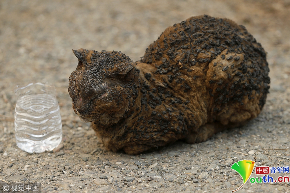 這場(chǎng)美國史上最嚴(yán)重山火導(dǎo)致7700多所房屋被毀,5萬多人流離失所。一只被燒傷的貓?jiān)诘却齽?dòng)物管理局到來救助。