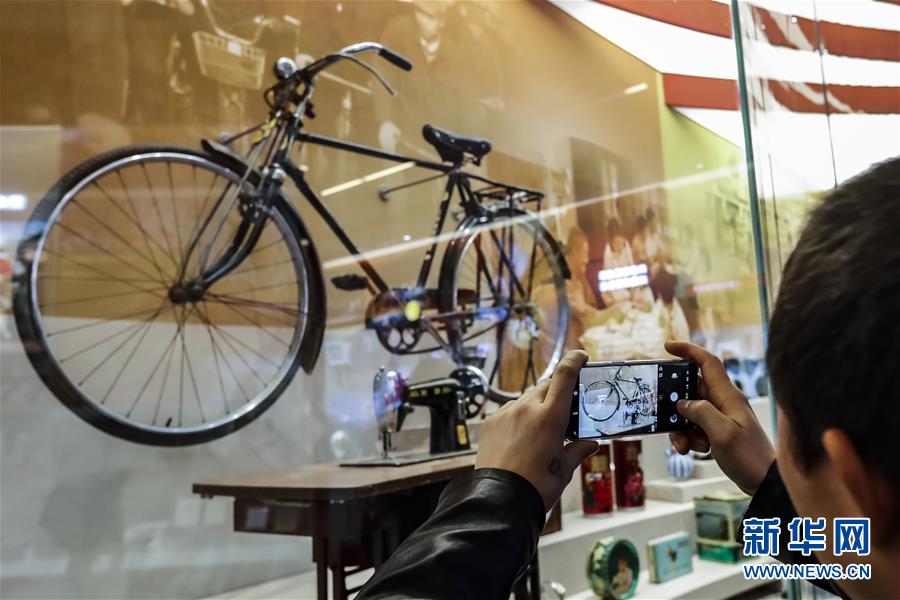 11月15日,在“歷史巨變”展區(qū),一名參觀者在拍攝老式自行車和縫紉機(jī)。