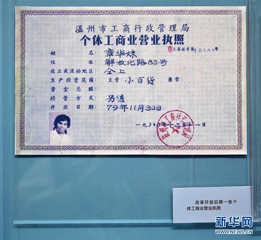 這是在“歷史巨變”展區(qū)拍攝的改革開(kāi)放后第一張個(gè)體工商業(yè)營(yíng)業(yè)執(zhí)照(11月15日攝)。