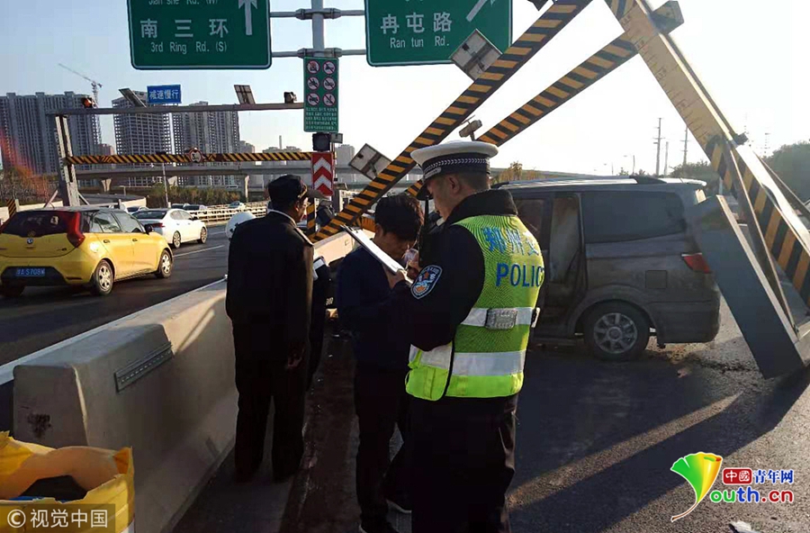 快速路司機(jī)開車“走神” 眨眼撞塌限高桿