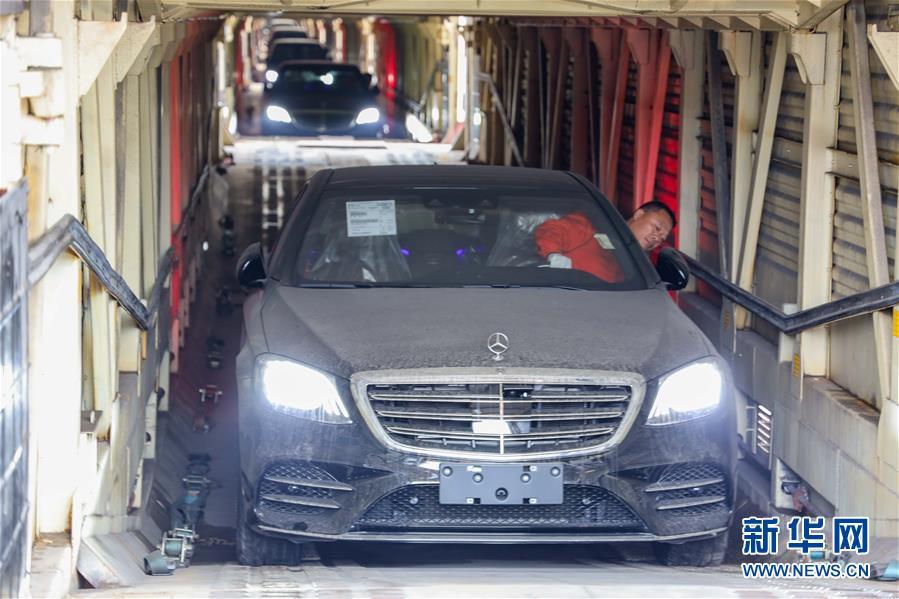 11月19日,在首趟中歐班列商品車專用車運輸國際班列的車廂內(nèi),工作人員駕駛著進口整車進行卸貨作業(yè)。 新華社記者 劉潺 攝