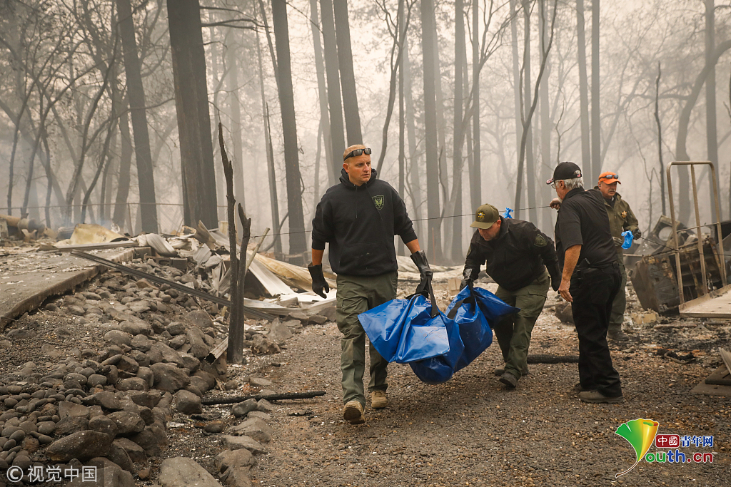 11月19日,在美國加利福尼亞州比尤特縣天堂鎮(zhèn),救援人員在山火廢墟中工作。