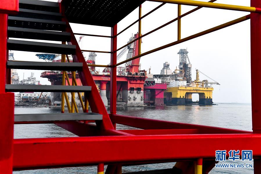 中集來福士海洋工程有限公司煙臺(tái)基地深水碼頭停放的半潛式鉆井平臺(tái)(11月14日無人機(jī)航拍)。新華社發(fā)(張丞攝)