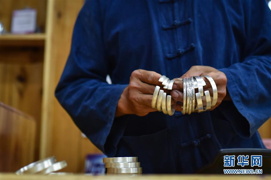 8月3日,唐白梅展示自己在龍懂陽的銀飾店里制作的銀鐲子。