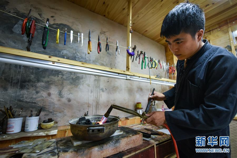 龍懂陽的弟弟龍?zhí)栆彩倾y飾工藝傳人。和哥哥不同,弟弟主打的是銀飾文化體驗(yàn)游,用自家傳統(tǒng)苗寨開設(shè)民宿,游客在此居住的同時,還能學(xué)習(xí)體驗(yàn)銀飾品制作。每年暑期一到,家長孩子絡(luò)繹不絕。新客源、新銷路、新模式帶動雷山縣銀飾業(yè)不斷發(fā)展壯大,成為脫貧攻堅(jiān)的重要產(chǎn)業(yè)。2017年,雷山縣控拜、麻料、烏高三個村銀飾品及相關(guān)產(chǎn)業(yè)銷售額超過1.5億元,吸引很多外出打工的年輕人回家創(chuàng)業(yè)。苗寨鍛銀聲在綠水青山間響遍千戶,也漸漸走出大山,聲名遠(yuǎn)播。新華社記者 李芒茫 攝