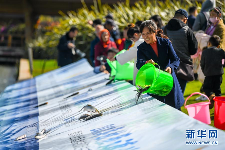 11月23日,市民在活動(dòng)現(xiàn)場(chǎng)投放魚苗。 新華社記者江文耀攝