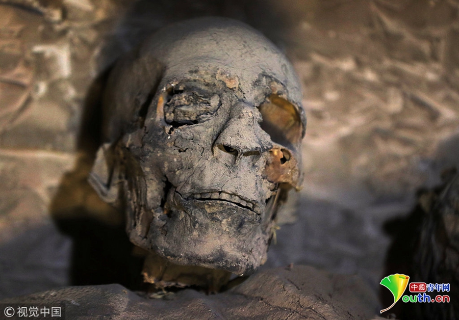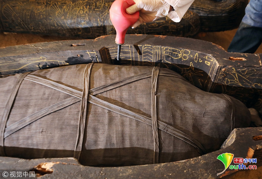 當(dāng)?shù)貢r(shí)間2018年11月24日,埃及盧克索,考古學(xué)家在當(dāng)?shù)匕l(fā)掘出一處墓穴,在其中發(fā)現(xiàn)石棺、木乃伊等文物,時(shí)間可追溯至公元前4-7世紀(jì)。圖片來源:視覺中國