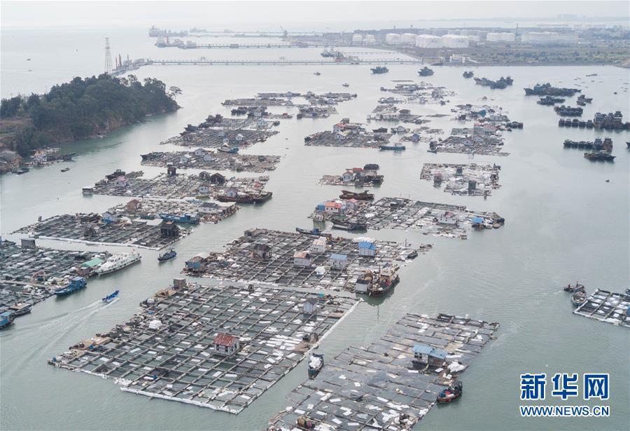 這是發(fā)生碳九泄漏事件的福建省泉州市泉港區(qū)南埔鎮(zhèn)肖厝村附近海域,漁排上鋪設(shè)了吸油氈(11月6日無人機拍攝)。