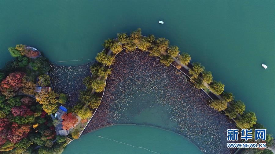 兩只小船行駛在湖南烈士公園年嘉湖湖面(11月25日無人機(jī)拍攝)。新華社記者 李尕?cái)z