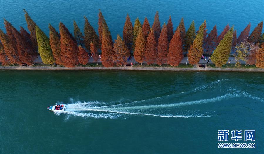 一艘游艇在湖南烈士公園年嘉湖湖面行駛(11月25日無人機(jī)拍攝)。新華社記者 李尕?cái)z