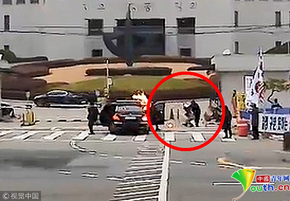 當(dāng)?shù)貢r(shí)間2018年11月27日,韓國(guó)首爾,27日上午9點(diǎn)10分,在首爾瑞草區(qū)的最高法院前面,一名74歲的示威男子向韓國(guó)最高法院院長(zhǎng)金明秀所乘的車輛投擲燃燒瓶。副駕駛一側(cè)的前輪和示威男子身上均起火,所幸被現(xiàn)場(chǎng)警察迅速撲滅,金明秀未受傷。當(dāng)時(shí),他正準(zhǔn)備去上班。