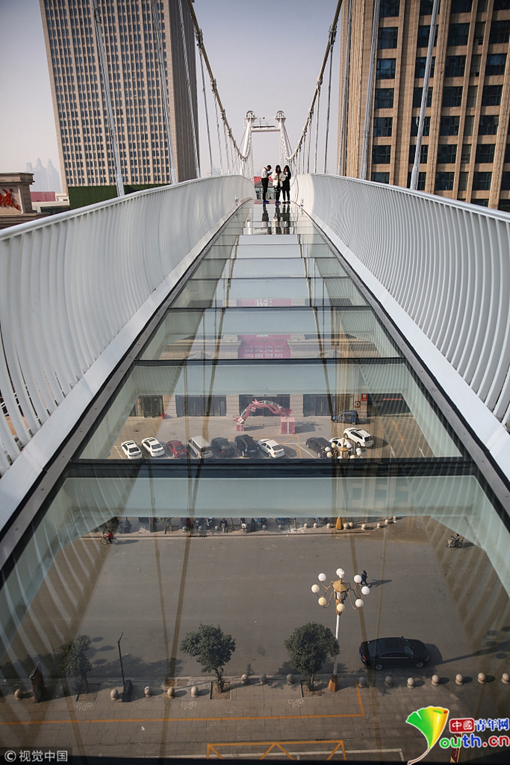 玻璃吊橋被三座高層寫(xiě)字樓所環(huán)繞,緊鄰石家莊火車(chē)站和南二環(huán)高架橋,車(chē)流、人流密集。
