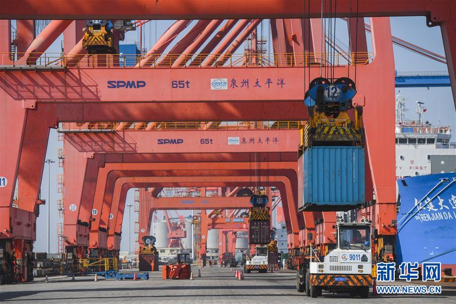 11月29日,在福建省石獅市蚶江鎮(zhèn)石湖港區(qū),泉州太平洋碼頭公司的大型機(jī)械在為一艘貨輪裝貨。  新華社記者 宋為偉 攝
