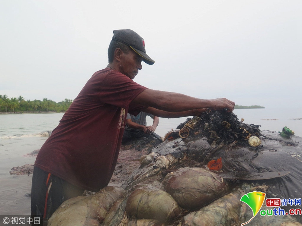 當(dāng)?shù)貢r(shí)間2018年11月19日,印尼瓦卡托比,當(dāng)?shù)匕l(fā)現(xiàn)一頭擱淺的鯨,肚子里滿是塑料垃圾。它的腹中有12斤塑料垃圾,其中包括115個(gè)杯子。