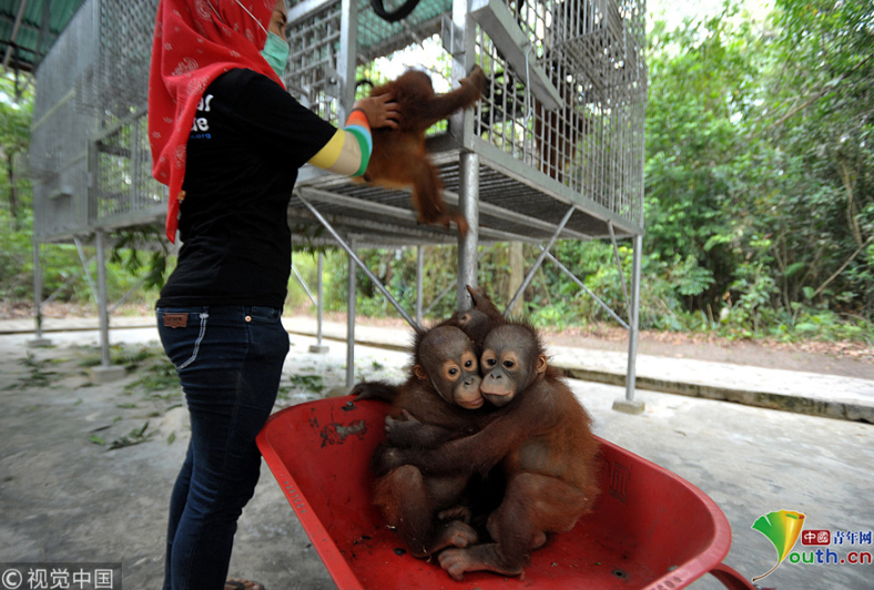 當(dāng)?shù)貢r(shí)間2018年9月18日,印尼加里曼丹克塔邦,國際動物救援(IAR)猩猩安全與保護(hù)中心里,飼養(yǎng)員用獨(dú)輪車把猩猩寶寶送到森林學(xué)校。圖片作者:Newscom