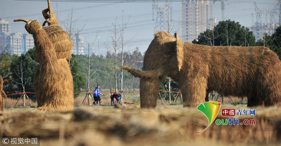 據(jù)悉,原本收割過的早稻由于不能焚燒,會直接粉碎入田。如今這些早稻的秸稈被搭成了景觀雕塑,也成了一道廢物利用的特色風景。圖片來源視覺中國