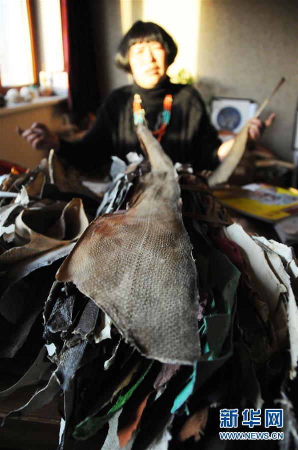 張琳的工作室堆滿了魚皮(2011年11月28日攝)。國家級非物質(zhì)文化遺產(chǎn)赫哲族魚皮制作技藝是我國赫哲族傳統(tǒng)手工藝術(shù)。作為這項(xiàng)技藝的黑龍江省級傳承人,十余年來,張琳一直從事魚皮畫的研究和創(chuàng)作,并通過做推廣、開講座、辦活動,讓更多年輕人了解并喜歡上這一傳統(tǒng)手工藝,將這項(xiàng)瀕臨失傳的藝術(shù)更好地傳承下去。新華社記者 王凱 攝