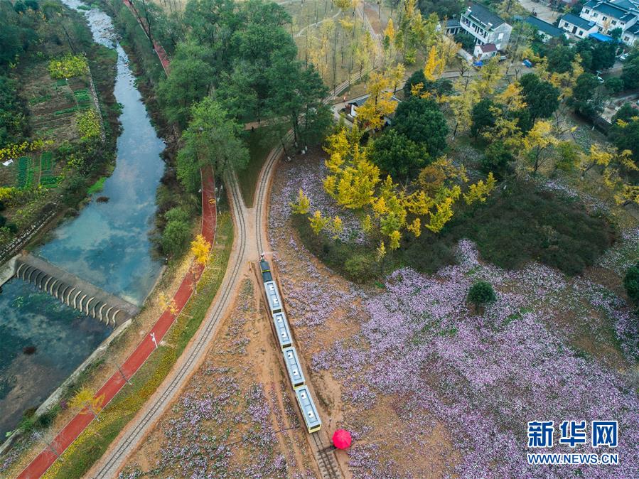 一列觀光小火車帶著游客穿行在銀杏林和花海之間(11月16日無人機(jī)拍攝)。近日,在浙江省長興縣小浦鎮(zhèn),“十里銀杏長廊”和近千畝花海經(jīng)過近一年的升級(jí)改造后,以嶄新的面貌與游客見面?;ê!⒂^光小火車、古村民宿、銀杏長廊等旅游項(xiàng)目全面提升了小浦鎮(zhèn)鄉(xiāng)村旅游的品質(zhì)。新華社記者 徐昱 攝