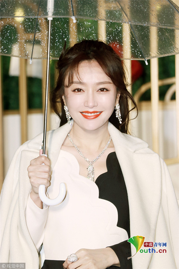 秦嵐撐傘雪膚紅唇美如畫 優(yōu)雅品香檳 ...