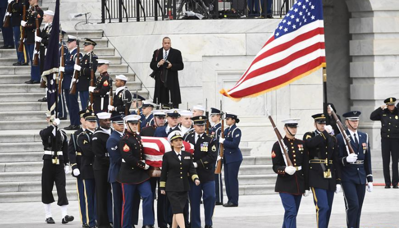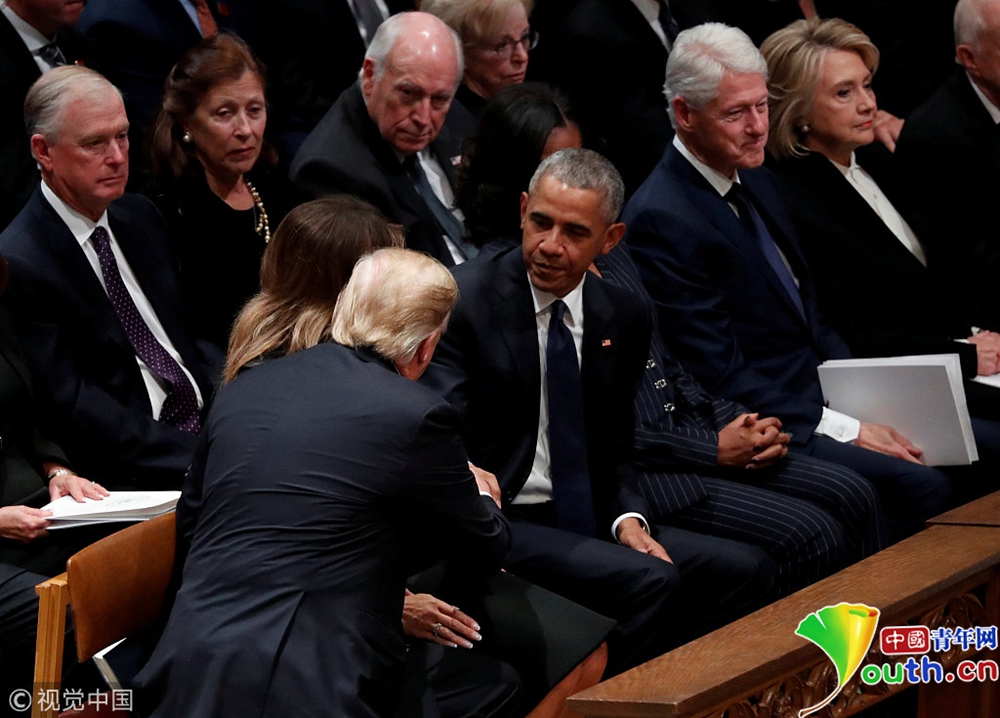 當?shù)貢r間2018年12月5日,美國華盛頓,美國國家大教堂舉行第41任總統(tǒng)老布什葬禮,美國現(xiàn)任和前任總統(tǒng)出席儀式,特朗普全程和克林頓夫婦無交流,僅與奧巴馬握了手。據(jù)美媒揭露,特朗普自2017年1月上任以來,從未與奧巴馬或克林頓夫婦交談。