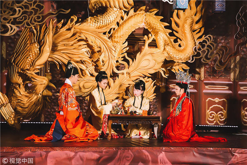 新郎趙佳瑞是嘉興人,今年28歲,比黃聰小兩歲,是一位攝影師。因為曾經(jīng)給黃聰拍攝漢服,他知道她有很多漢服,就經(jīng)常向她借漢服給客人拍攝,經(jīng)常接觸就相戀了?,F(xiàn)在夫妻倆在當(dāng)?shù)亻_了專門拍攝古風(fēng)的攝影工作室。工作室就三個人,除了小夫妻,還有黃聰?shù)拈|蜜楊曉晨做化妝師。在婚禮上,這些小姐妹都穿上漢服,像一個個漂亮的宮女。