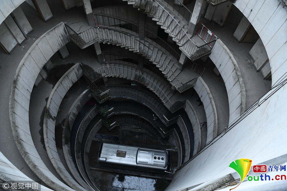 魔幻重慶再添新景觀 公交車穿8層空心圓筒樓