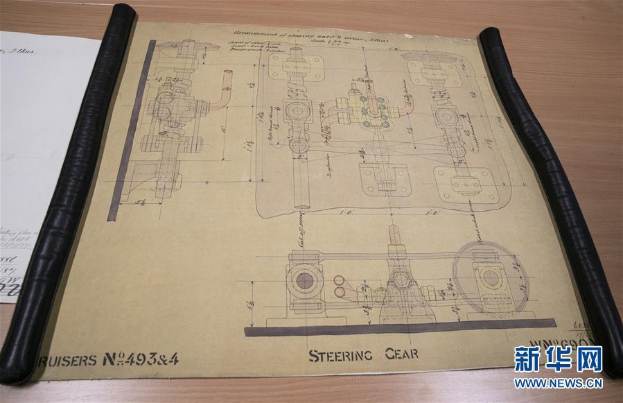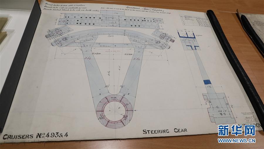 這是11月2日,在英國(guó)紐卡斯?fàn)柵臄z的橫跨在泰恩河上的紅白兩色的鋼鐵旋轉(zhuǎn)橋泰恩橋。當(dāng)年,致遠(yuǎn)艦就是從這里駛向大海,開(kāi)啟東方征程。 新華社記者日前在紐卡斯?fàn)柼┒鳌枡n案館查找北洋海軍史料時(shí)發(fā)現(xiàn)一套七張、檔案名為“中國(guó)巡洋艦舵機(jī)設(shè)計(jì)圖”的原始圖紙。塵封百年,甲午海戰(zhàn)中抗擊日艦后沉沒(méi)的清北洋海軍致遠(yuǎn)艦部分原廠設(shè)計(jì)圖紙?jiān)谄浣ㄔ斓亍?guó)紐卡斯?fàn)柺械囊患覚n案館首次被發(fā)現(xiàn),為打撈那段悲壯的歷史提供了重要參考。 新華社記者 韓巖 攝