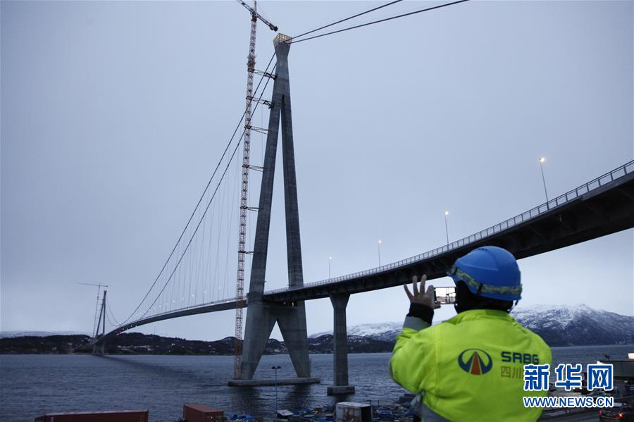 12月9日,中國(guó)工人和挪威市民在挪威哈羅格蘭德大橋上行走。 新華社記者梁有昶攝