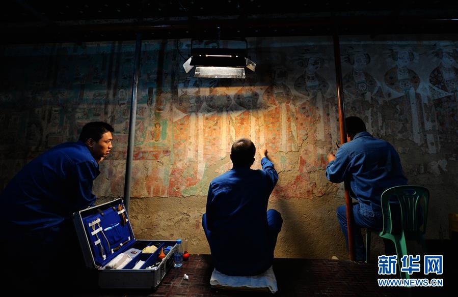 技術(shù)人員在莫高窟內(nèi)對(duì)病害壁畫(huà)進(jìn)行修復(fù)(2014年9月3日攝)。 敦煌記錄歷史。開(kāi)放的胸襟,曾讓這里成為古代絲綢之路上“華戎所交一都會(huì)”。 時(shí)隔千年,改革開(kāi)放的春風(fēng)吹入西北內(nèi)陸小城,敦煌再度成為中國(guó)對(duì)外開(kāi)放的文化前沿。 新華社記者 陳斌 攝