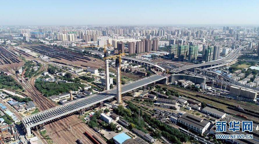9月7日無人機(jī)拍攝的鄭北大橋鋼梁頂推施工現(xiàn)場。當(dāng)日,跨越鄭州北站的鄭北大橋鋼梁頂推成功。鄭北大橋是東西走向的鄭州市農(nóng)業(yè)路快速通道工程的一部分,需跨越鄭州北站。由于列車不能中斷運(yùn)行,鄭北大橋不能采用常見的搭腳手架方式施工,而是采用頂推法,即在大橋一端把橋身拼接好,然后一段一段朝著鐵路編組站上方送過去,最終完成橋梁架設(shè)。新華社記者朱祥攝