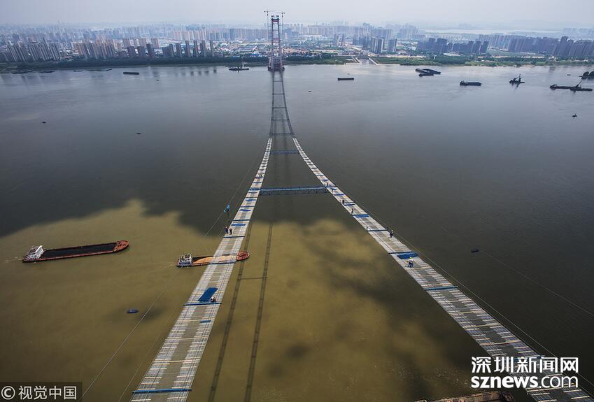 2018年5月14日,武漢,武漢楊泗港長江大橋上空,上部結(jié)構(gòu)施工進(jìn)入貓道面網(wǎng)鋪設(shè)階段,數(shù)十名中鐵大橋局工人在跨江高空拼搏趕超,江面上空的臨時(shí)“吊橋”悄然形成。數(shù)十名工人在長江上空228米處拼搏趕超,臨時(shí)“天梯”悄然形成。