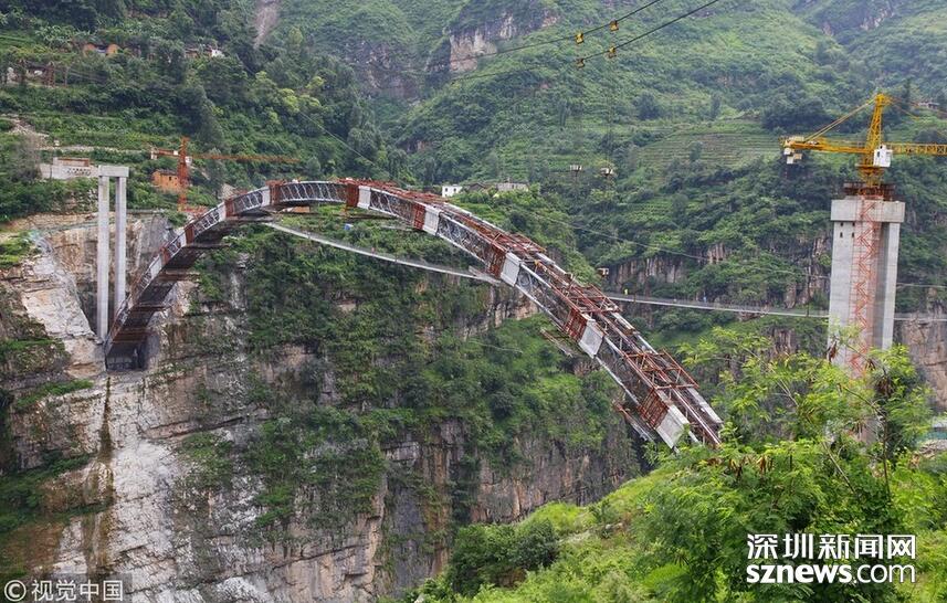 畢都高速公路北盤江大橋是杭瑞高速公路畢都段的控制性工程,位于貴州省和云南省交界處,由貴州省和云南省共建。該橋橋面至江面高差達(dá)565米,成為目前世界第一高橋。主橋?yàn)殇撹炝盒崩瓨?,主?20米,目前位居同類型橋梁2016年12月29日正式通車。