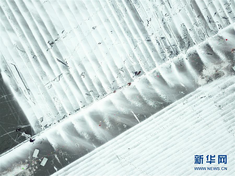 在松花江哈爾濱段江面,工人們?cè)谶M(jìn)行切割和采冰工作(12月12日無(wú)人機(jī)拍攝)。 黑龍江哈爾濱市的冰雪主題樂(lè)園哈爾濱冰雪大世界的采冰和建設(shè)工作近日拉開(kāi)帷幕。為保證足夠的優(yōu)質(zhì)冰供給,每天有近千名采冰人和700多輛運(yùn)冰車參與到采冰工作。 新華社記者 王松 攝