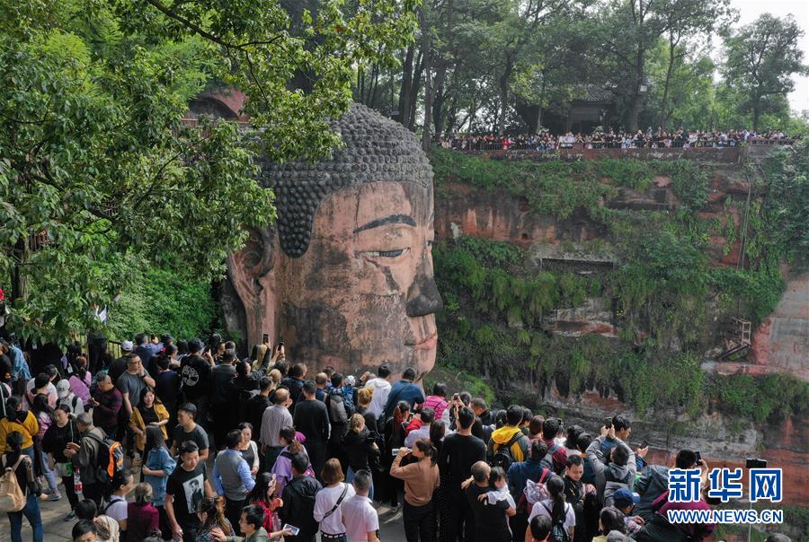 10月4日,游客在樂山大佛前排隊一睹大佛真容(無人機(jī)拍攝)。 新華社記者 江宏景 攝