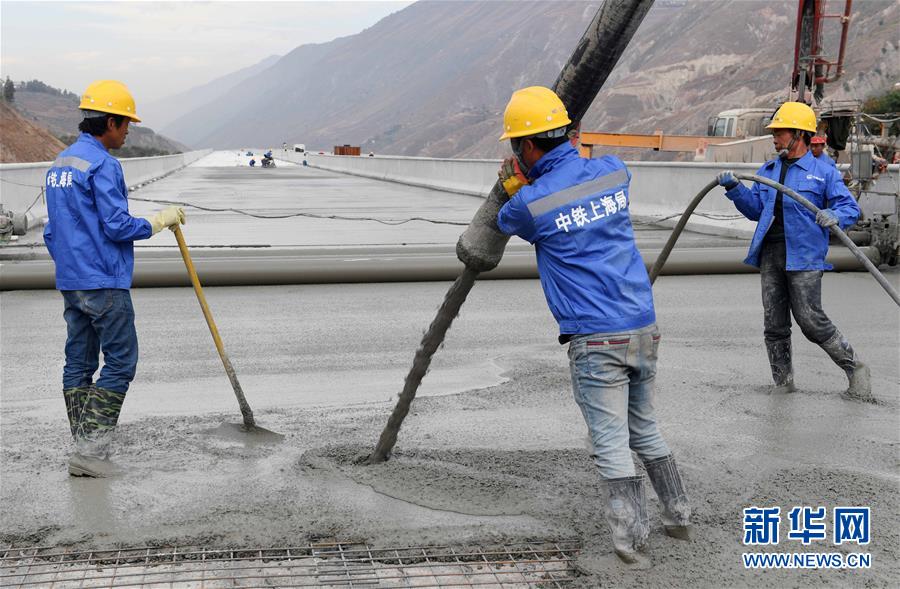 12月15日,中鐵上海局集團公司的施工人員在東格高速公路土建項目中進行橋面附屬工程作業(yè)。