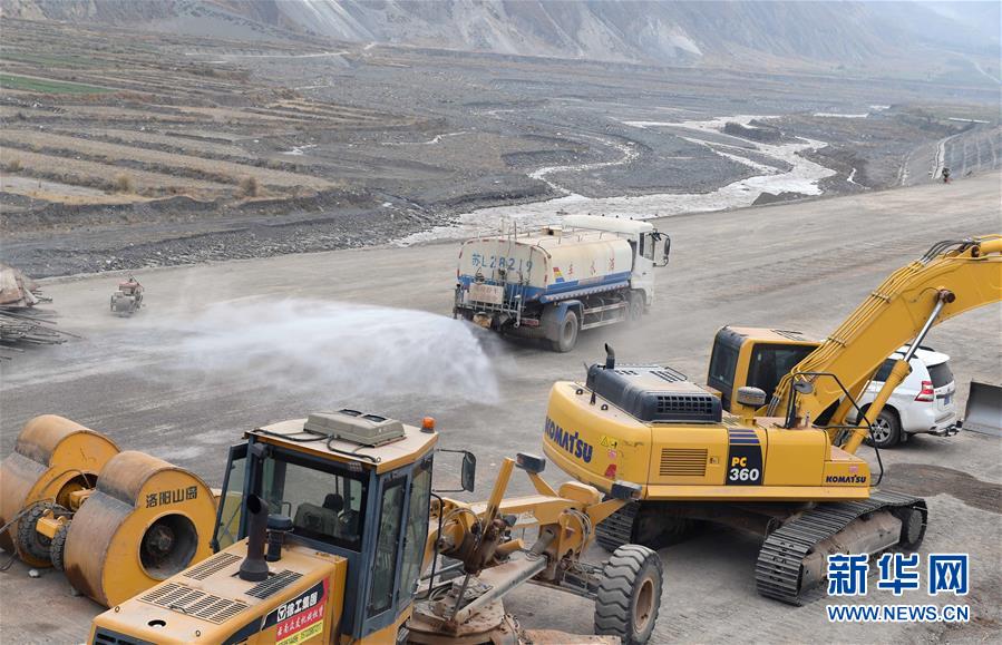 12月15日,一輛灑水車在中鐵上海局集團公司施工的東格高速公路土建項目工地進行灑水降塵作業(yè)。新華社記者楊宗友攝
