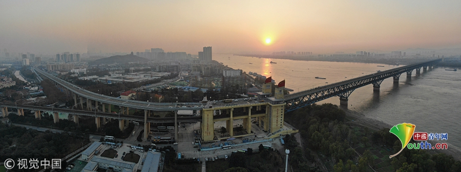 2017年9月19日,南京長江大橋正橋的混凝土面板已經(jīng)全部拆除,僅剩交錯縱橫的鋼桁架橫跨在長江之上,從高空俯瞰猶如一條“鋼鐵巨龍”。