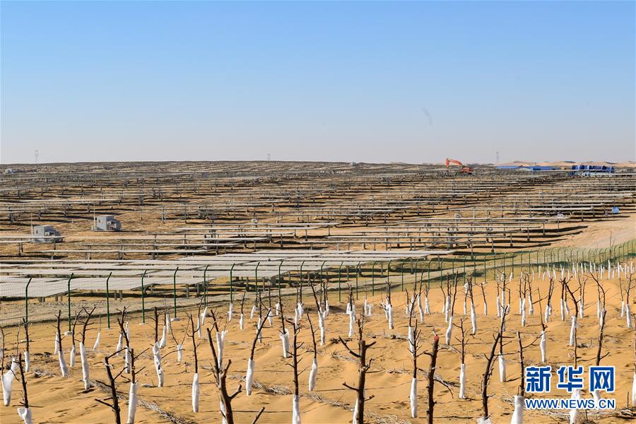 位于庫布其沙漠腹地的達(dá)拉特光伏發(fā)電應(yīng)用領(lǐng)跑基地一期500兆瓦項(xiàng)目(12月13日攝)。