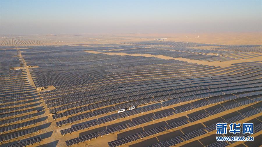 位于庫布其沙漠腹地的達拉特光伏發(fā)電應(yīng)用領(lǐng)跑基地一期500兆瓦項目(12月13日無人機拍攝)。 新華社記者 彭源攝