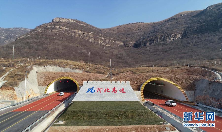 12月16日,兩輛汽車(chē)行駛在京秦高速公路二期工程河北玉田境內(nèi)的鳳凰頂隧道路段(無(wú)人機(jī)拍攝)。 新華社記者楊世堯攝