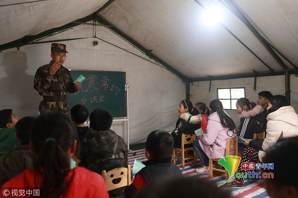 武警宜賓支隊(duì)政治工作處宣傳保衛(wèi)股股長(zhǎng)朵祝偉為周家鎮(zhèn)新塘安置點(diǎn)的“帳篷學(xué)校”的學(xué)生上抗震常識(shí)課。