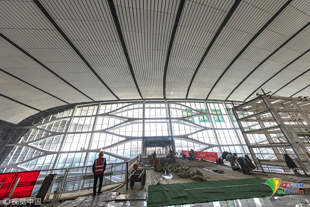 中國(guó)青年網(wǎng)北京12月20日電 2018年12月19日,北京大興國(guó)際機(jī)場(chǎng)航站樓的屋面已基本完工,一只金色“鳳凰”完整地出現(xiàn)在北京城南。航站樓的室內(nèi)裝修在有條不紊的推進(jìn)中。