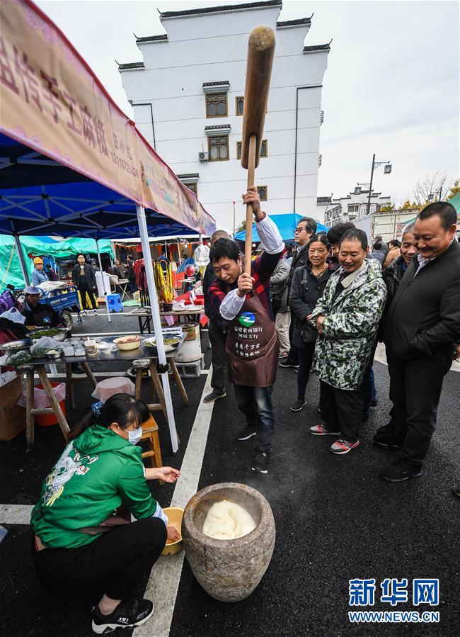 11月19日,商戶在廟會現(xiàn)場展示傳統(tǒng)打年糕。 新華社記者 徐昱 攝