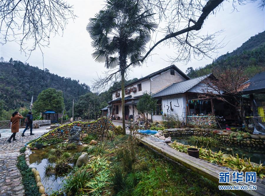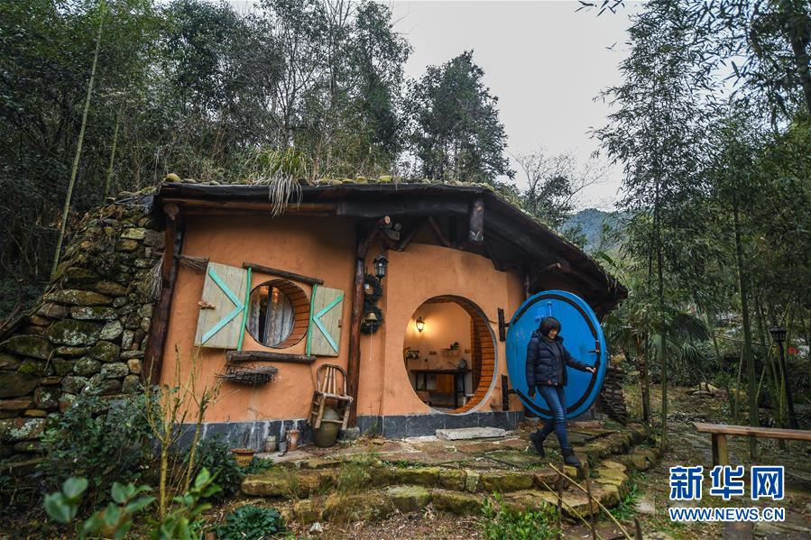 12月19日,客人走進民宿“僻地寒樓”。該民宿共有7幢風格各異的小屋分布在山坡上,頗具特色。河橋鎮(zhèn)青年張雁辭去了上海的工作,回到家鄉(xiāng)開辦了這家民宿。 新華社記者 徐昱 攝
